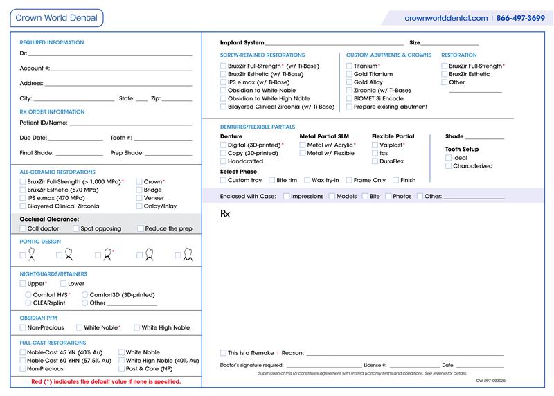 Crown World Dental Lab provides a NO-FAULT REMAKE POLICY for products that are still under warranty.